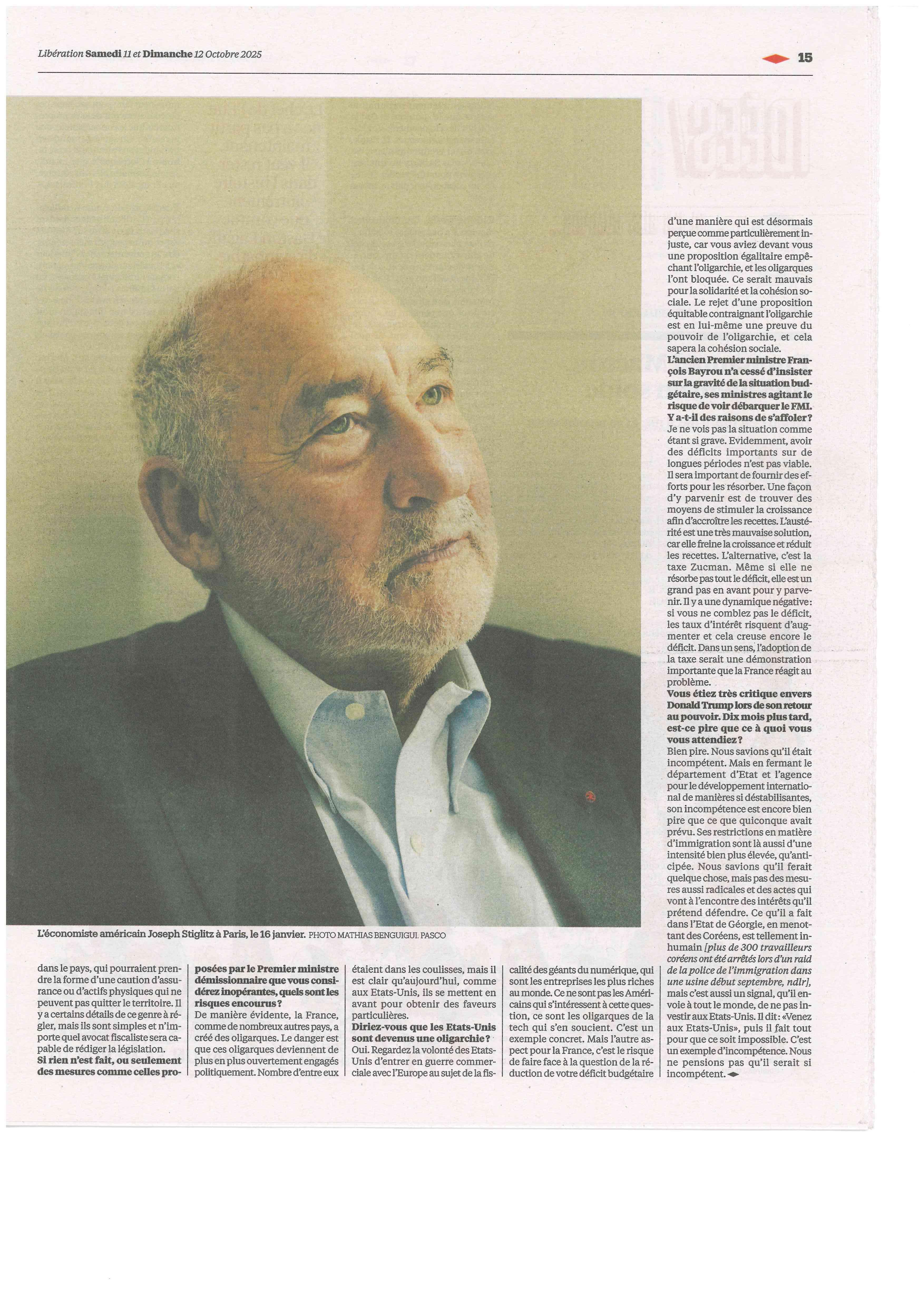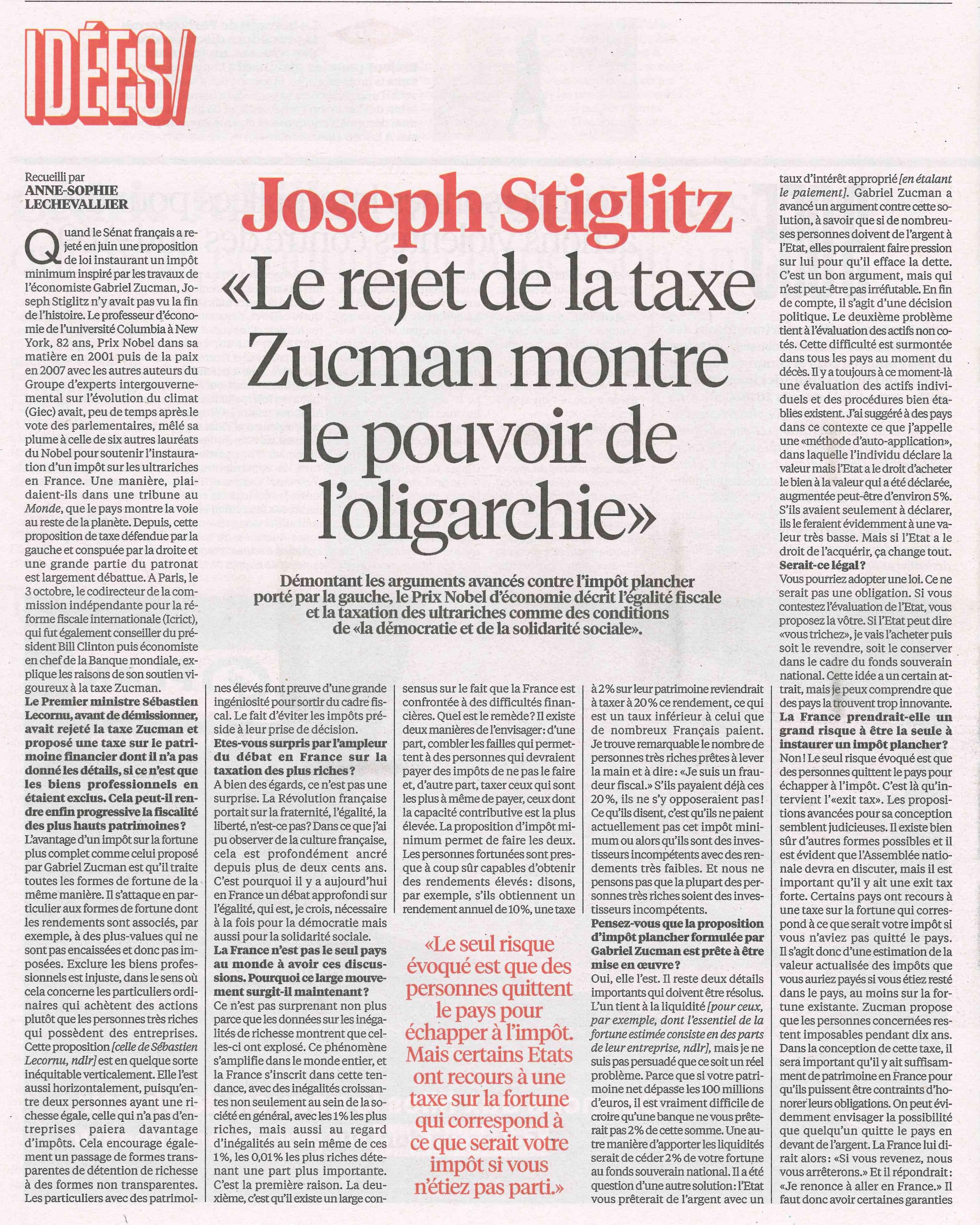 Joseph Stiglitz "Le rejet de la taxe Zucman montre le pouvoir de l'oligarchie"