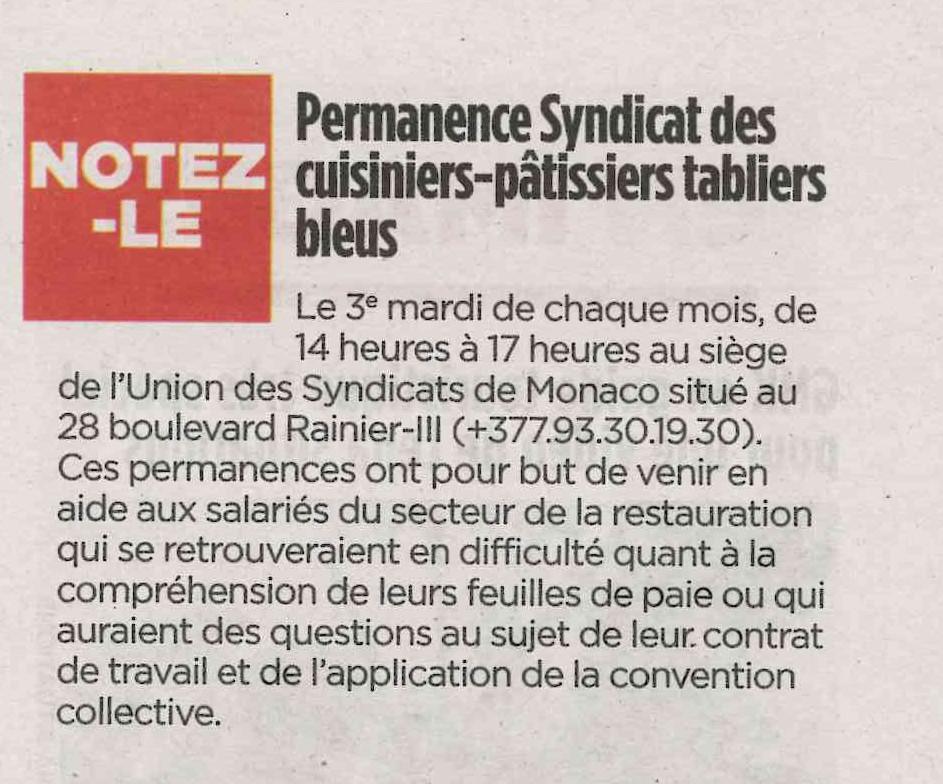 Permanence du Syndicat des Cuisiniers pâtissiers, tabliers bleus